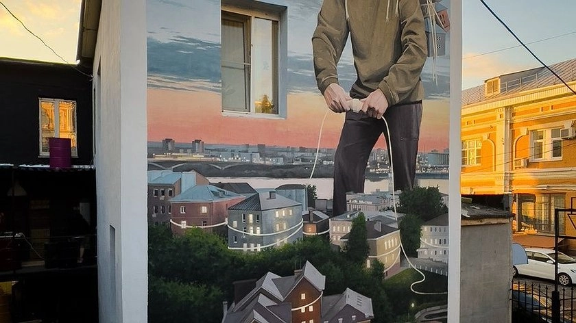 И эта работа тоже не исключение. Она про объединение, про свет, то есть этот персонаж является неким проводником, который соединяет стоящие внизу дома в гирлянду. Если мы находимся на веранде и смотрим на эту картину, то видим на заднем плане тот же самый пейзаж: Волгу, знаменитый нижегородский закат. То есть эта работа полностью пропитана духом места, духом Нижнего Новгорода, — пояснил художник.