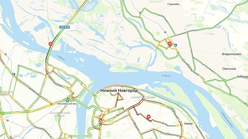 Самые большие заторы наблюдаются в центре города. Наиболее сложная ситуация наблюдается на улицах Белинского, Большой Печерской, Родионова, Минина, Алексеевской, Пискунова, Ковалихинской, Варварской, Казанском съезде и Нижне-Волжской набережной.