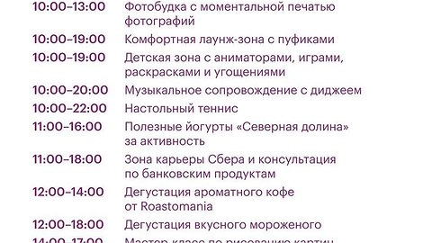 В программе мероприятия всех посетителей ждут диджей-сеты, фото-будка с моментальной печатью фото, консультация по банковским продуктам и карьере в Сбере, настольный теннис, мастер-класс по рисованию картин, дегустация ароматного кофе от Roastomania, бесплатное мороженое, вкусные и полезные йогурты от бренда «Северная Долина» и многое другое.