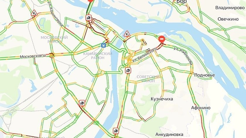 В верхней части города движение затруднено на улицах Белинского, Октябрьской, Пискунова, Максима Горького, Ковалихинской, Варварской, Ошарской, Большой Покровской, Лысогорской, Анкудиновском шоссе, Нижне-Волжской набережной и проспекте Гагарина.