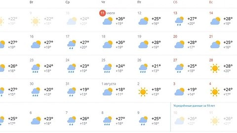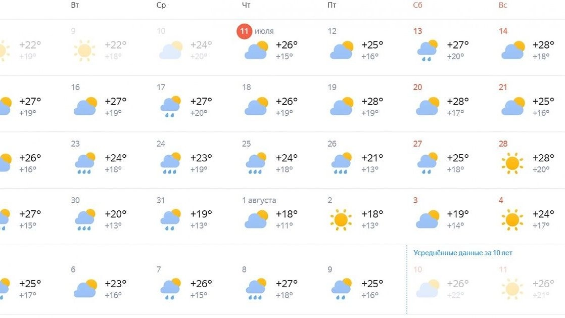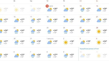 Неделя с 15 по 21 июля будет жаркой. Столбики термометров поднимутся до +28°С к концу недели. Судя по данным, осадки выпадут только в среду, 17 числа. Однако с 23 июля и до начала последнего летнего месяца каждый день будет дождливым.