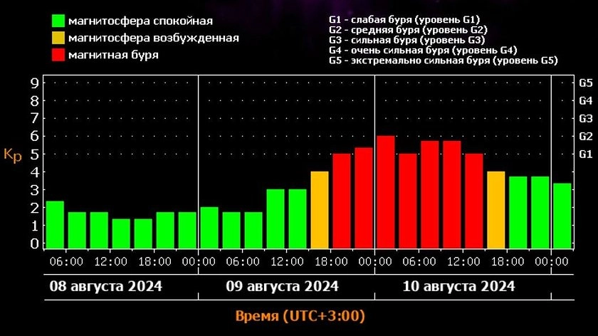 Небольшие возмущения магнитосферы ожидаются уже после обеда 9 августа. После 18:00 начнется слабая магнитная буря уровня G1. После полуночи ее уровень достигнет отметки G2, то есть средней магнитной бури. Возмущения магнитного поля прекратятся ближе к 18:00 10 августа.