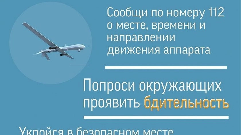 При появлении БПЛА в небе населению рекомендовано укрыться в безопасном месте и также сообщить об обнаружении летательного устройства, указав направление его движения.