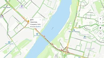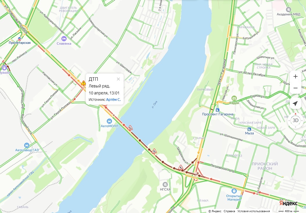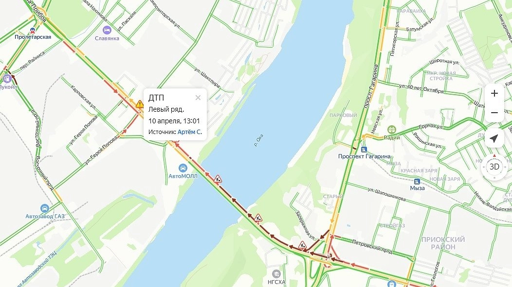 Авария произошла на Мызинском мосту в Нижнем Новгороде днем 10 апреля. Об этом сообщает сервис «Яндекс. Карты».