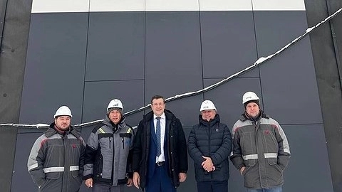Глава региона проконтролировал ход работ, проводимых на стройплощадке. В настоящее время специалисты проводят обшивку фасада.
