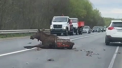Лось был сбит неустановленным автомобилем на кстовской объездной дороге. Видео с регистратора очевидца опубликовано в Telegram-канале «Нижний Новгород БЕЗ ЦЕНЗУРЫ».