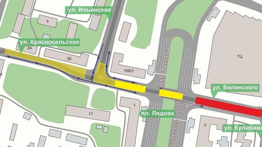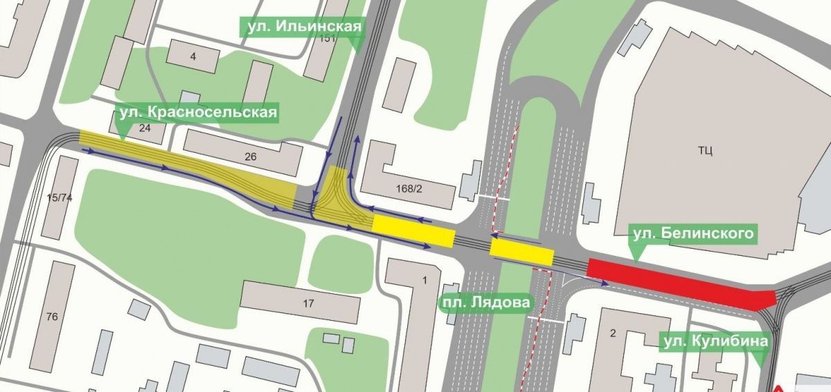 Реконструкция трамвайной линии будет вестись участке от площади Лядова до улицы Кулибина. При этом проезд в обоих направлениях сохраняется.