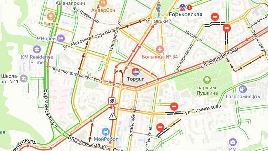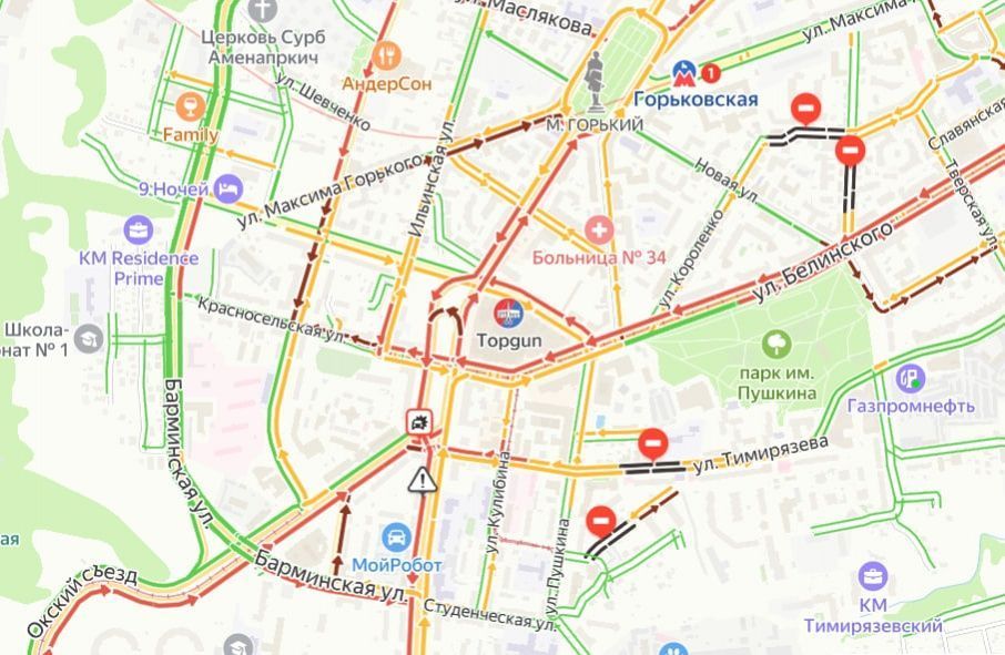 Пробка сковала участки проспекта Гагарина, Окского съезда, улиц Максима Горького, Белинского, Малой Ямской, Барминской, Большой Покровской и Красносельской.