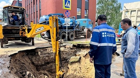 Специалисты выявили место повреждения и определили характер необходимых работ, для которых задействованы восемь единиц техники, включая высокотехнологичную, а именно: вакуумный экскаватор, который позволил быстро добраться до места повреждения в условиях повышенной влажности грунта.