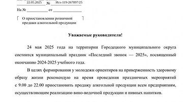 Глава Городецкого округа Александр Мудров разослал в местные торговые предприятия письмо, в котором призвал приостановить продажу спиртных напитков с 9:00 до 22:00 24 мая, когда в школах будет проходить «Последний звонок». Текст документа он опубликовал у себя в Telegram-канале.
