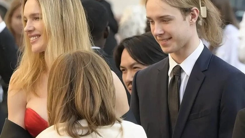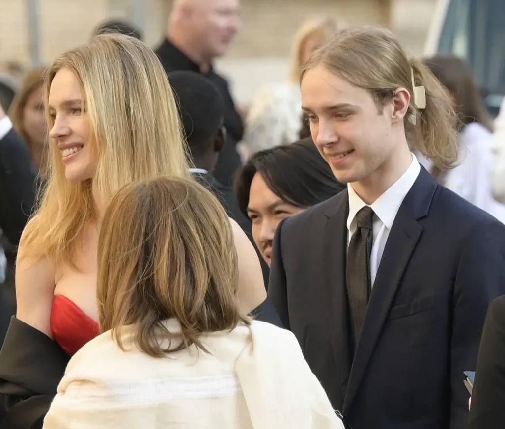 Папарацци сфотографировали мать и сына, когда те выходили из автомобиля. 43-летняя звезда была одета под стать мероприятию, в черное вечернее платье Valentino с красным лифом, ее младший сын выбрал классический синий брючный костюм и черный галстук. Однако в этот вечер Виктора выделил из толпы аксессуар — его длинные волосы были собраны на затылке с помощью бежевого «крабика».