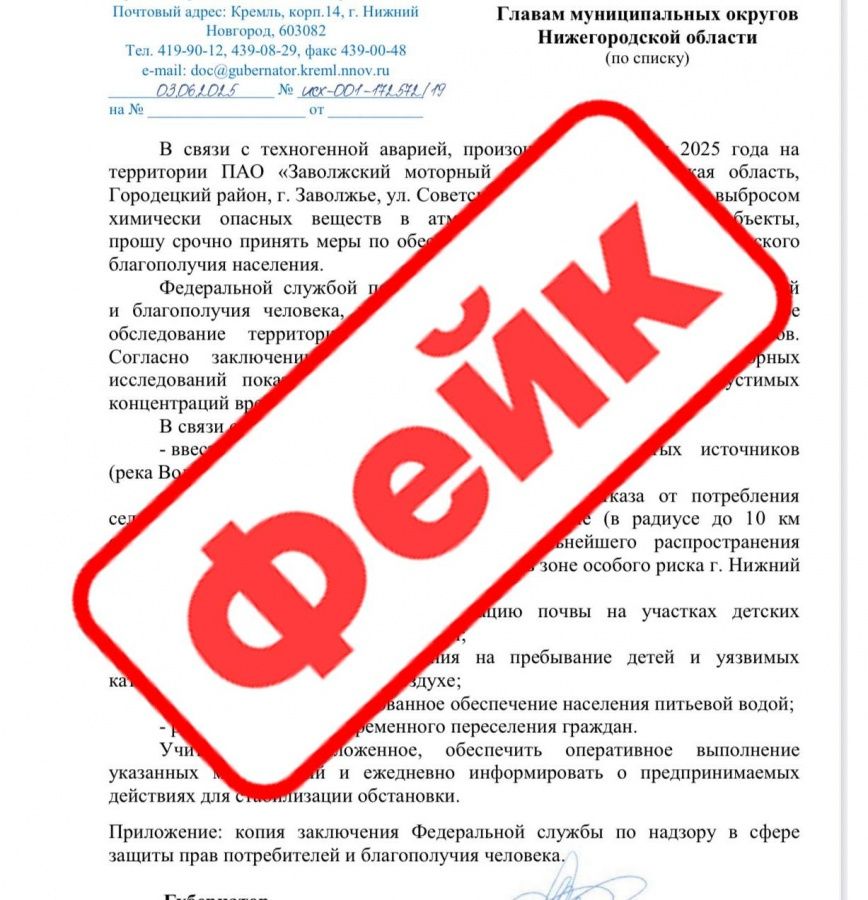 В документе в котором говорится о якобы произошедшей техногенной аварии на моторном заводе в Заволжье, из-за которой «случился выброс химически опасных веществ». И для защиты населения якобы необходимо принять срочные меры.