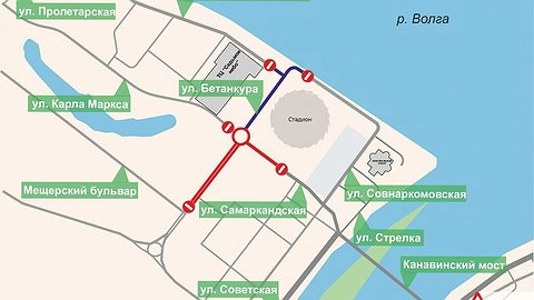 С полуночи до 18:00 14 июня будет перекрыт участок улицы Бетанкура от Волжской набережной до улицы Самаркандской, а с полуночи до 15:00 15 июня — участок той же дороги от Волжской набережной до Мещерского бульвара.