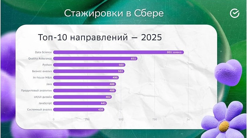 Число кандидатов на стажировку в Сбер увеличилось на 45%, конкурс составил 72 человека на место, а самое популярное направление — анализ данных и машинное обучение