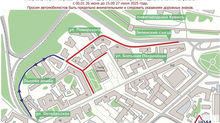 Так, с начала дня 26 июня до 15:00 27 июня будет перекрыт участок улицы Пожарского от главной площади города до дома № 4 по улице Пискунова, а также участок улицы Пискунова от дома № 4 до улицы Большой Покровской и дома № 1 на Театральной площади.