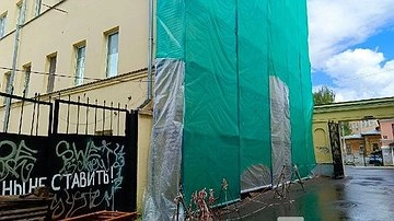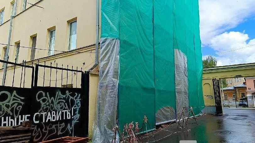 Речь идет о доме, расположенном на улице Варварской, рядом с площадью Минина и Пожарского. Его фасад и торец сейчас уже полностью скрыты за зеленым тентом, за которым установлены строительные леса. О серьезности намерений также говорит баннер: «Нижний Новгород — у нас все по-настоящему». При этом каких-либо рабочих на объекте нет.