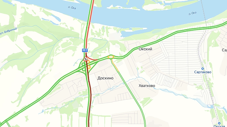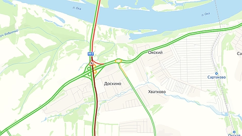 Заторы растянулись почти на 4,5 км. Она начинается у деревни Крутец в Богородском округе и заканчивается уже около съезда со Стригинского моста.