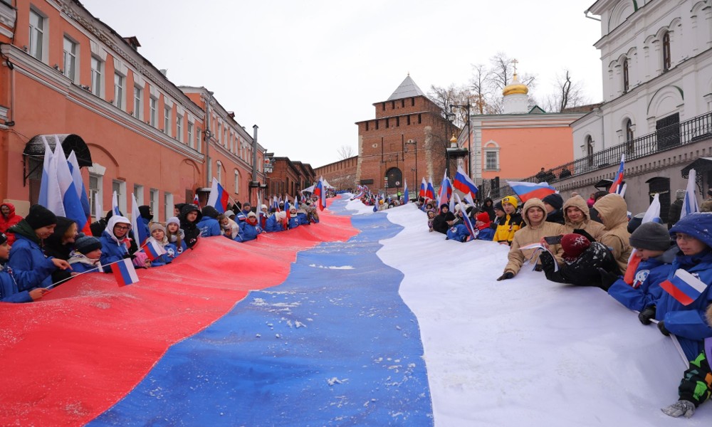 В 13:45 на Ивановском съезде развернут 100-метровый флаг России, после чего у памятника Минину и Пожарскому начнётся торжественная часть. С площади отправятся добровольцы и гуманитарный груз в зону СВО.