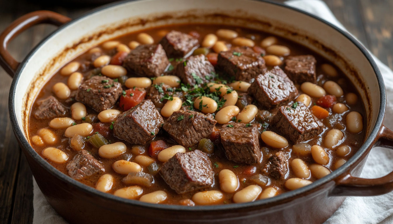 Говядина — отличный источник белка, железа и витаминов группы В, а фасоль богата растительным белком, клетчаткой и минералами. Такое сочетание не только вкусное, но и полезное — помогает поддерживать энергию и насыщать организм важными нутриентами. Томаты усиливают усвоение железа из мяса и фасоли, делая это блюдо особенно питательным.