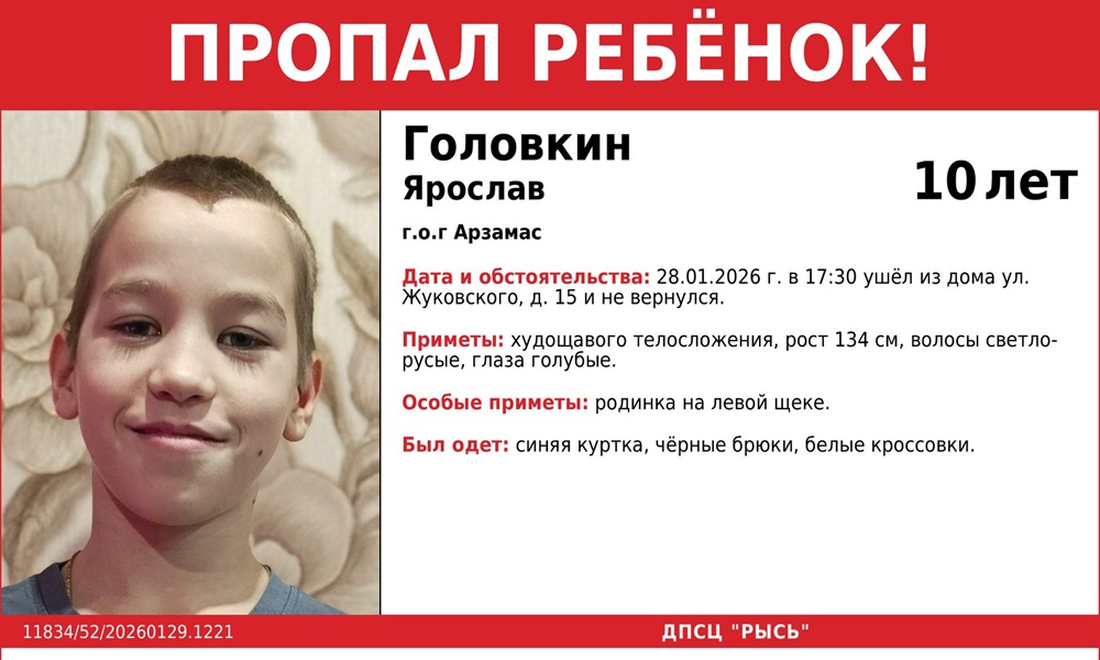 В Арзамасе Нижегородской области разыскивают Ярослава Головкина. Школьник ушел из дома на улице Жуковского 28 января около пяти часов вечера и до сих пор не вернулся. Материалы с приметами разместили в группе ПСО «Рысь».