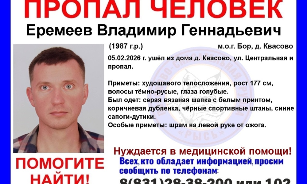 В Нижегородской области разыскивается Владимир Еремеев, 1987 года рождения. Он пропал 5 февраля 2026 года, уйдя из дома в деревне Квасово (Борский городской округ). Ориентировку разместил ПСО «Рысь».