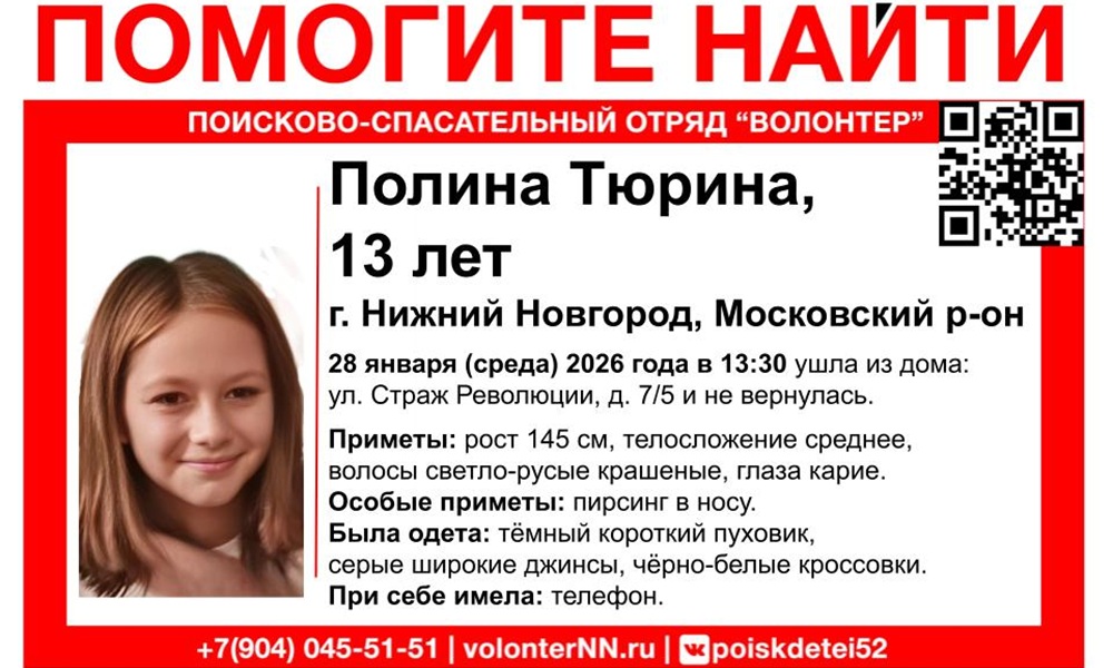 В Нижнем Новгороде разыскивают 13-летнюю школьницу. Полина Тюрина ушла из дома в Московском районе 28 января около 13:30 и до сих пор не вернулась. Ориентировку разместили на страницах ПСО «Волонтер».