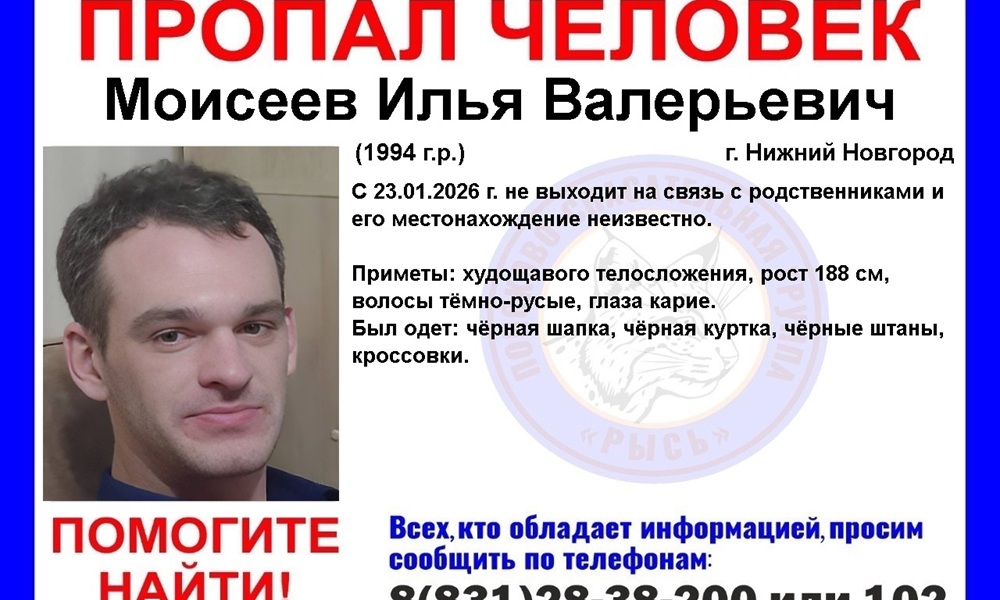 В Нижнем Новгороде объявлен розыск Ильи Моисеева, 1994 года рождения. Местонахождение 31-летнего мужчины неизвестно с 23 января 2026 года. Информацию о пропавшем опубликовал на своих страницах поисково-спасательный отряд «Рысь».