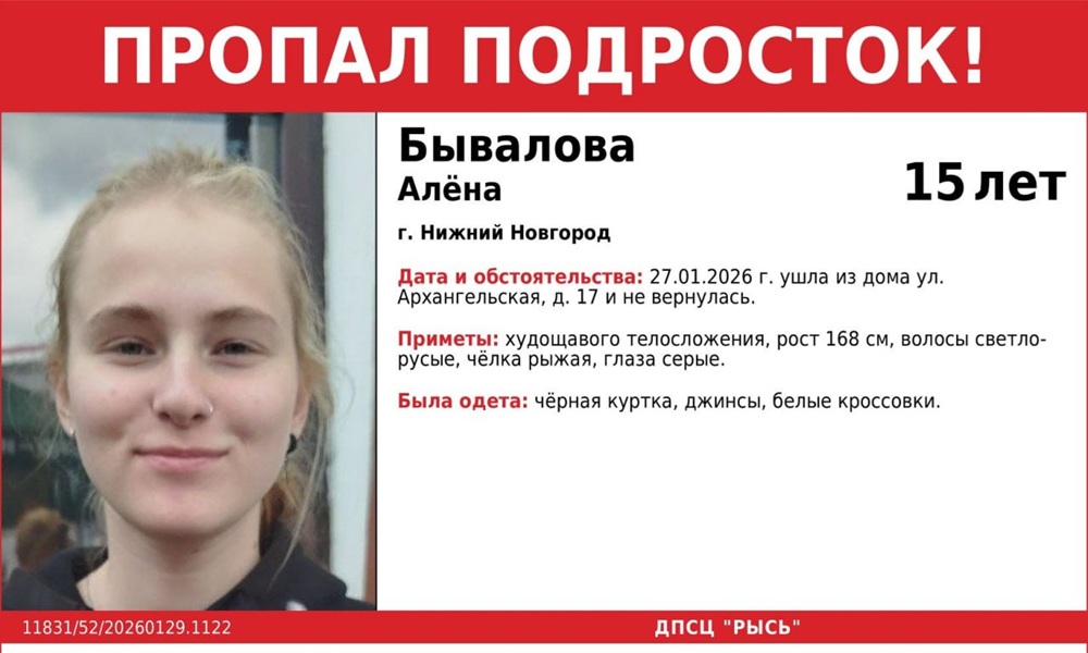В Нижнем Новгороде уже третий день ищут 15-летнюю школьницу Алену Бывалову. Девочка ушла из своего дома на Архангельской улице 27 января и до сих пор не вернулась. Ориентировку разместил ПСО «Рысь».